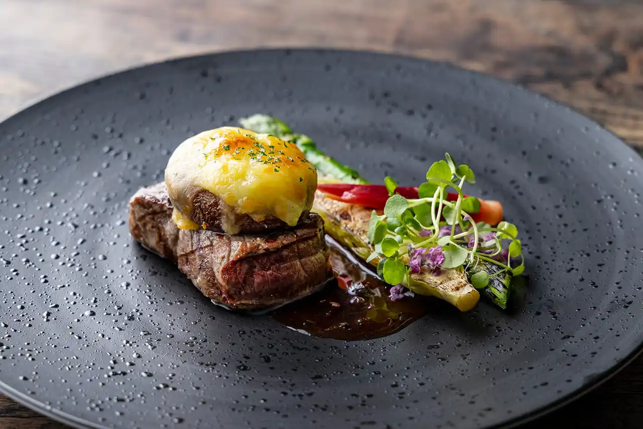 環境にこだわり丁寧に飼育された「豊穣の地 北の大地牛」をグリル。シイタケを器にした、マッシュポテトと北海道産カマンベールチーズのグラタンを添えました。 |