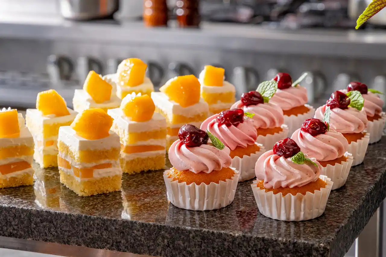 北海道メロンをたっぷり挟んだ軽やかなショートケーキ(写真左)や、バニラのスポンジケーキにグリオットチェリーのクリームとコンポートをトッピングしたカップケーキ(写真右)など、初夏を堪能するデザート5種をお好きなだけ。 |