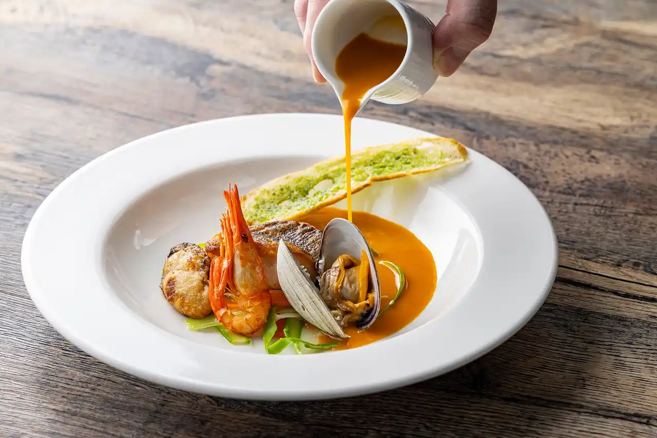 毎回テーマに合わせた旬の魚介を用いる「セリーズ」のシグネチャーメニュー。今回は、特大のあさりや、旨味が凝縮した北海シマエビ、高級魚クロソイが彩ります。北海道が誇る海の幸と滋味深いスープをご堪能ください。 |