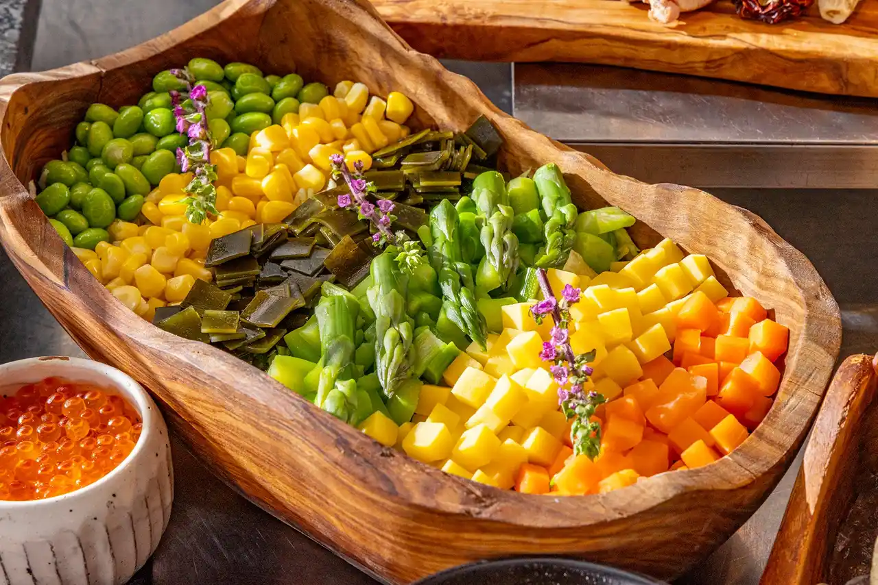 北海道産の昆布やアスパラガス、コーンなど色とりどりの食材を使用したコブサラダ。ビタミンやミネラルが豊富で夏の体を労わる栄養たっぷりの一品です。 |