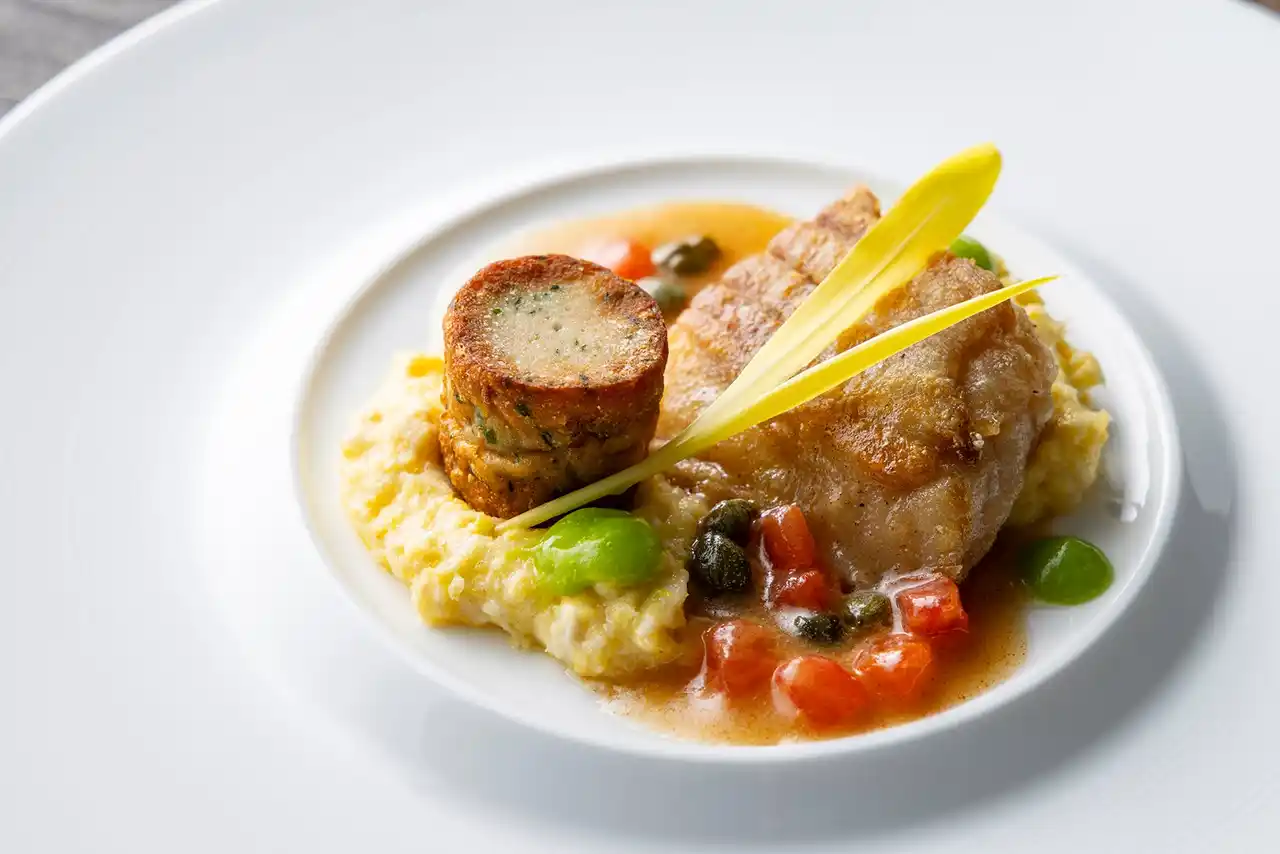 ・ 北海道産カスベのムニエル クリーミーポレンタ ブラウンバターソース |