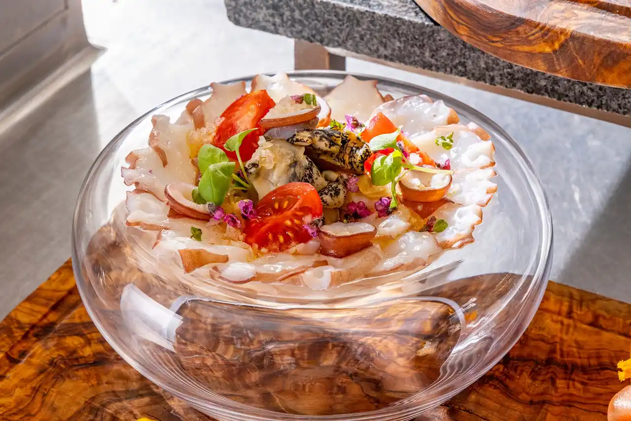 ミズダコのカルパッチョ 北海道完熟トマトとつぶ貝 |