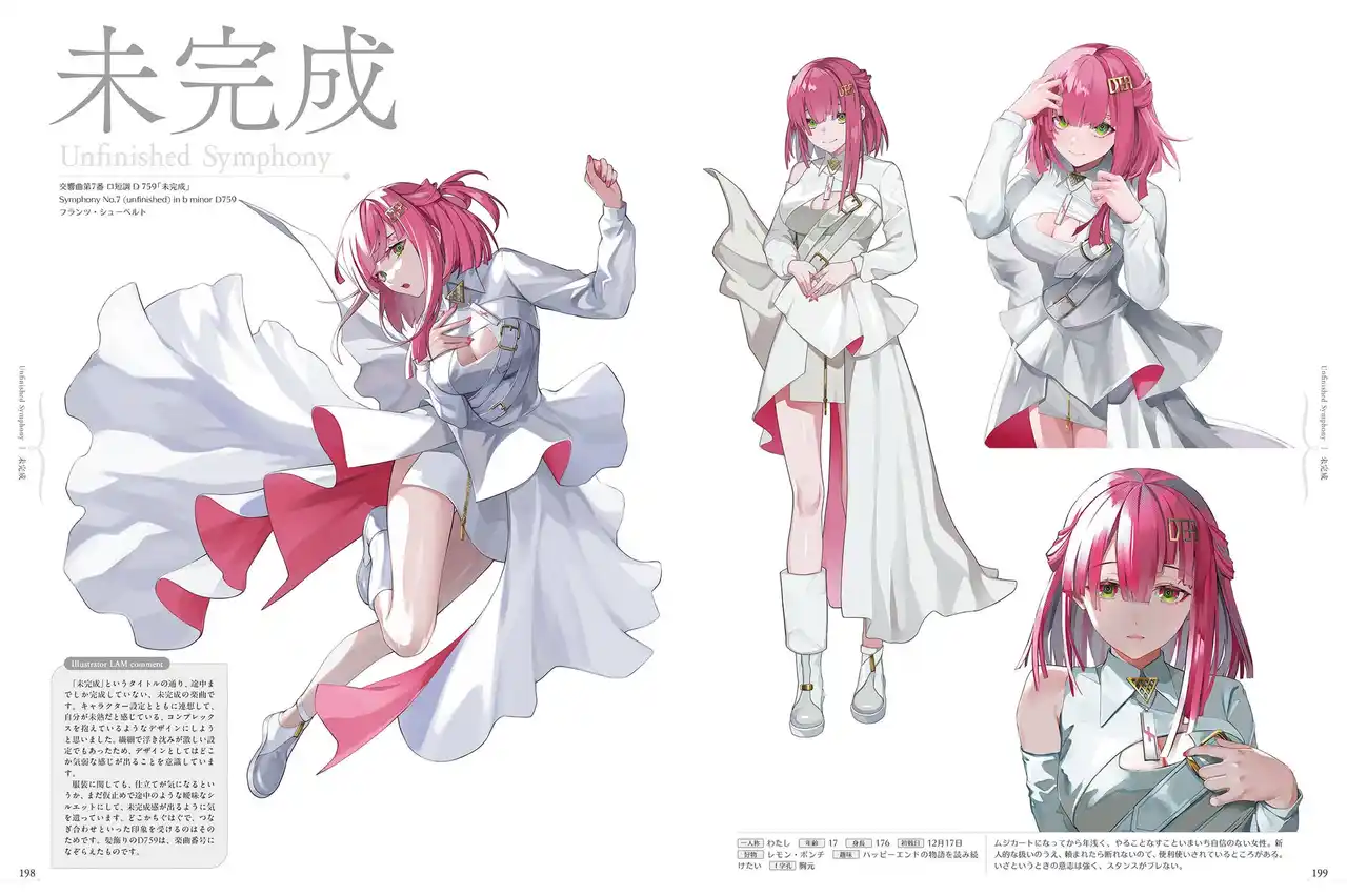 本書は、そのプロジェクト内でイラストレーターLAM氏が描く、気高くも儚いムジカート(キャラクター)たちの魅力を多彩なビジュアルで収録しています。 |