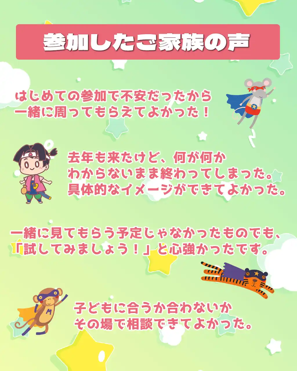本サービスは昨年も実施し、12組の家族にご参加いただきました。参加者からは「安心して回ることができた」「具体的なイメージができた」といった声が寄せられています。 また、今年はすでにリピートの参加申し込みもあり、サービスの継続的な価値が評価されています。 |