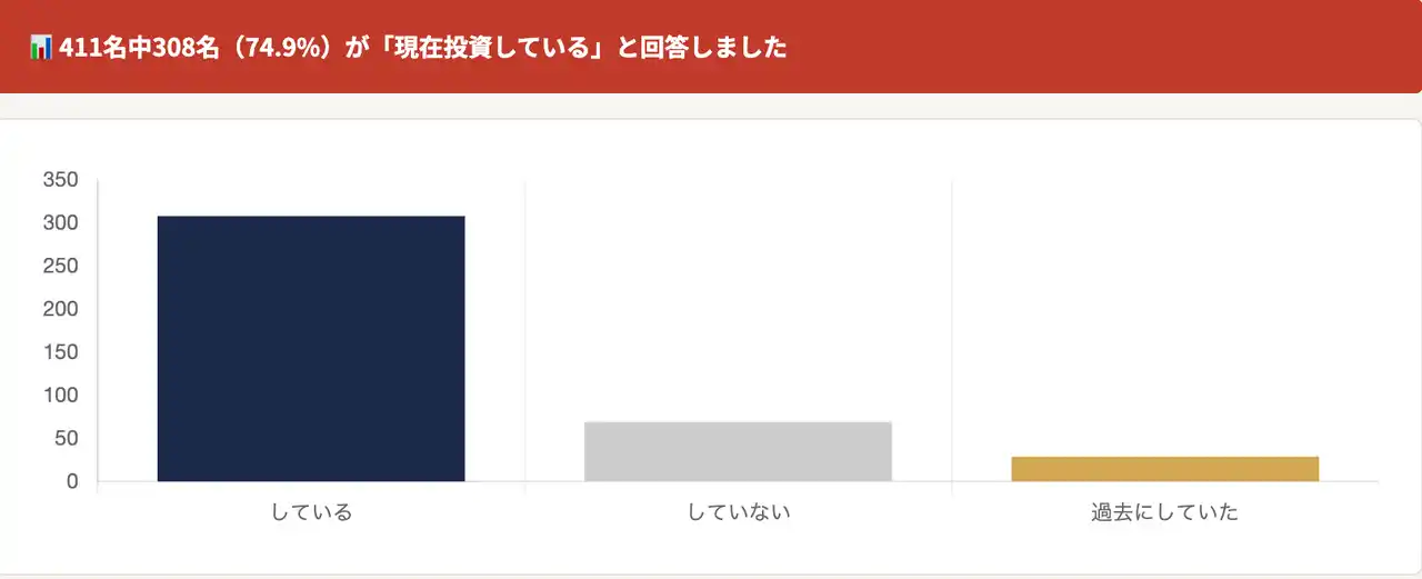 「現在、投資・資産運用をしていますか?」という質問に対し、411名中308名(74.9%)が「している」と回答しました。「過去にしていたが今はしていない」(7.1%)を含めると、82%が投資経験者という結果になりました。 |