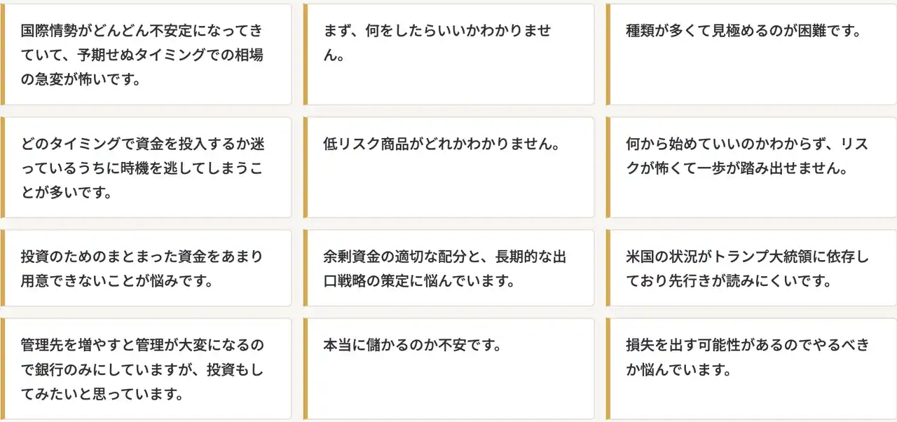 投資に関心を持ちながらも「情報の少なさ」「わからなさ」「怖さ」が実際の行動を妨げていることが伺えます。 |