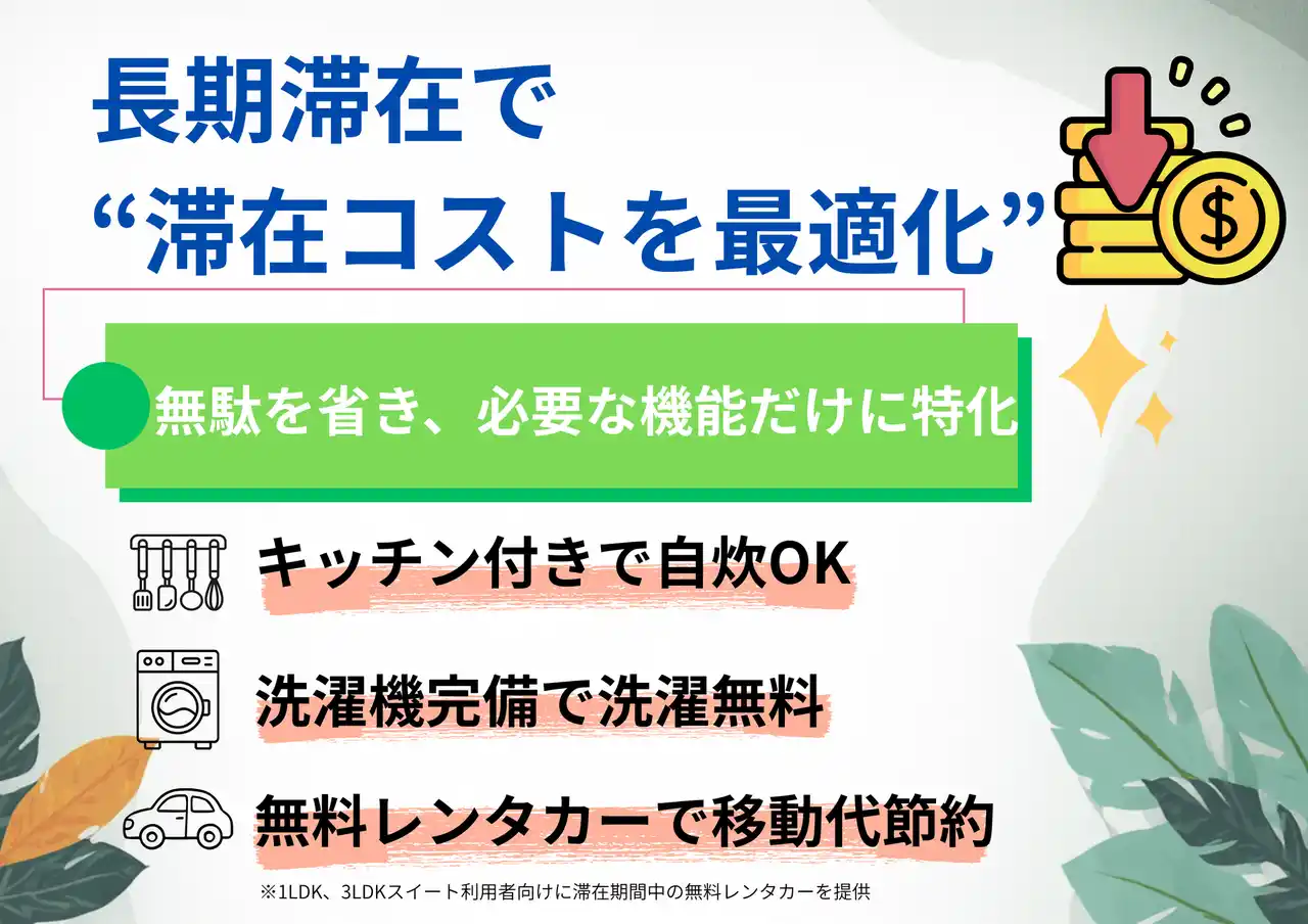 1LDK、3LDKスイート利用者向けに滞在期間中の無料レンタカーを提供。