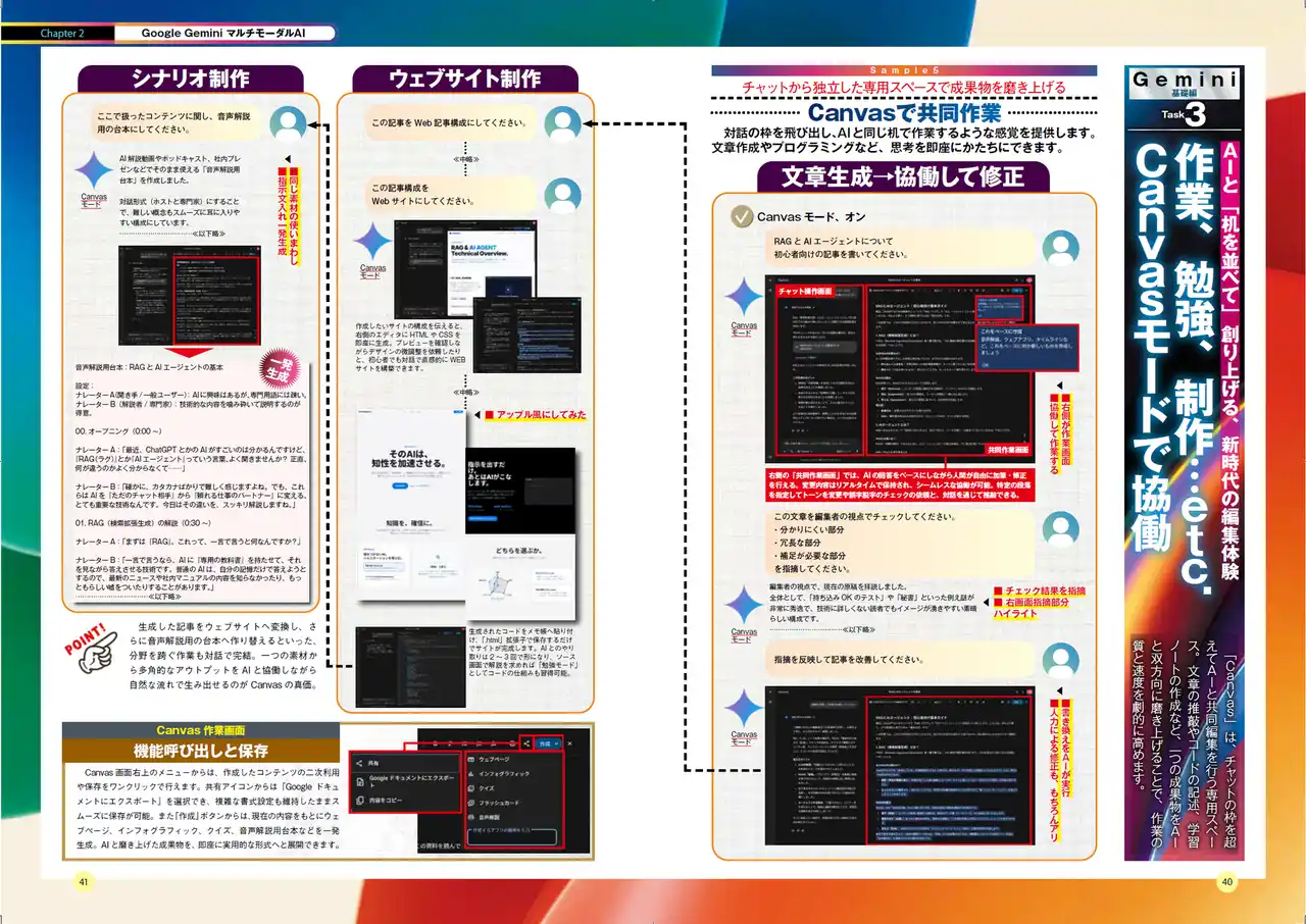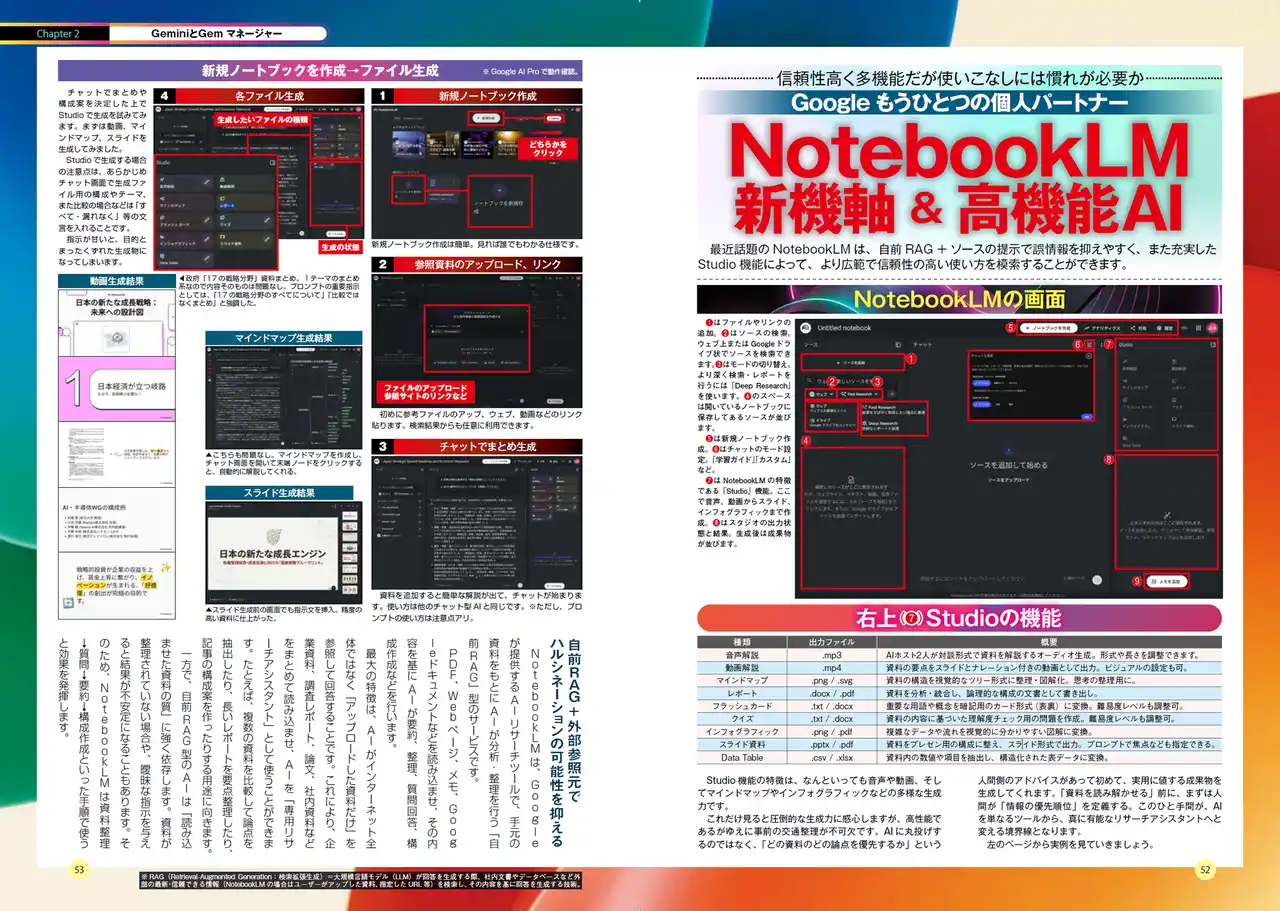 メール、マップ、スケジュール管理などGoogleアプリ、Microsoft 365 アプリとの連携、スマートフォン活用やライブでAIと会話して情報取得する方法など、マルチモーダルな使い方も掲載しています。また、話題のNotebookLMも丁寧に解説してあります。