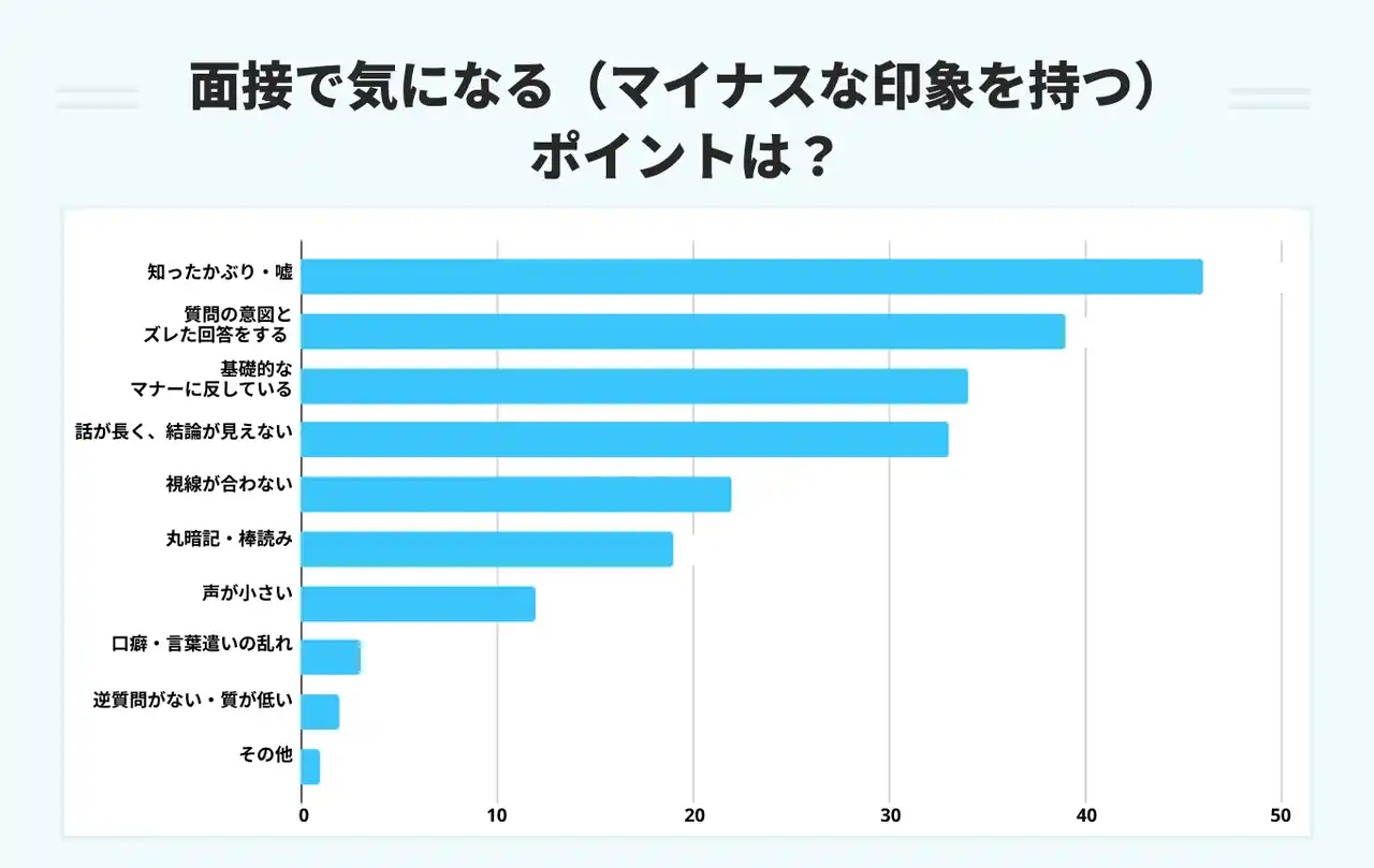 「面接でマイナスな印象を持つポイント」のワースト1位は「知ったかぶり・嘘(64.8%)」、次いで「質問の意図とズレた回答をする(54.9%)」という結果になりました。社会人としての「基礎的なマナー違反(47.9%)」も上位に入りましたが、それ以上に「自分を実態以上に良く見せようとする不誠実な態度」や「対話のズレ」が厳しく評価を落とす要因となっています。 |