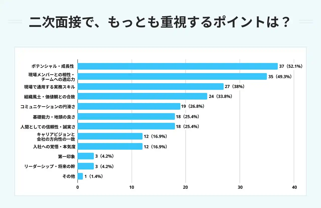 一次面接では「第一印象(76.1%)」「コミュニケーションの円滑さ(74.6%)」など基礎的な対話力が重視されるのに対し、二次面接では「ポテンシャル・成長性(52.1%)」「現場メンバーとの相性(49.3%)」といった実務や組織への適性へとシフトします。 |