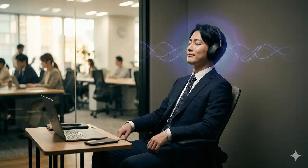 | 専門知識も、社員への説明も不要です。オフィス・ラウンジ・スパの共有スペースに音源を流すだけで、脳疲労が自動的にリセットされる環境が整います。 | ||||||||||