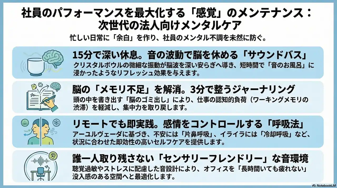 | ▶企業の福利厚生・健康経営部門 オフィスのラウンジ・休憩室・リモートワーク中のメンタルケアBGMとして活用できます。また、音と呼吸法、ジャーナリング、視覚瞑想を組み合わせたメンタルケア講座のパッケージも人気です。体験者の95%が「周りに広めたい」と回答する満足度が、社内での自然な定着を後押しします。 | ||||||||||