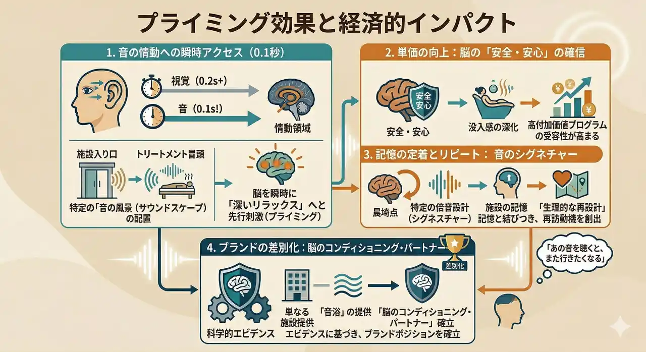 | 音は、視覚よりも速く0.1秒で脳の情動領域に届きます。特定の「音の風景(サウンドスケープ)」を施設の入り口やトリートメントの冒頭に配置することで、顧客の脳を瞬時に「深いリラックス状態」へと先行刺激(プライミング)します。独自の倍音設計(音のシグネチャー)が記憶と強く結びつくことで、「あの音を聴くと、あの場所に行きたくなる」という生理的な再訪動機を創出。施術やサービスへの没入感が深まり、独自のブランドポジションを確立します。 | ||||||||||