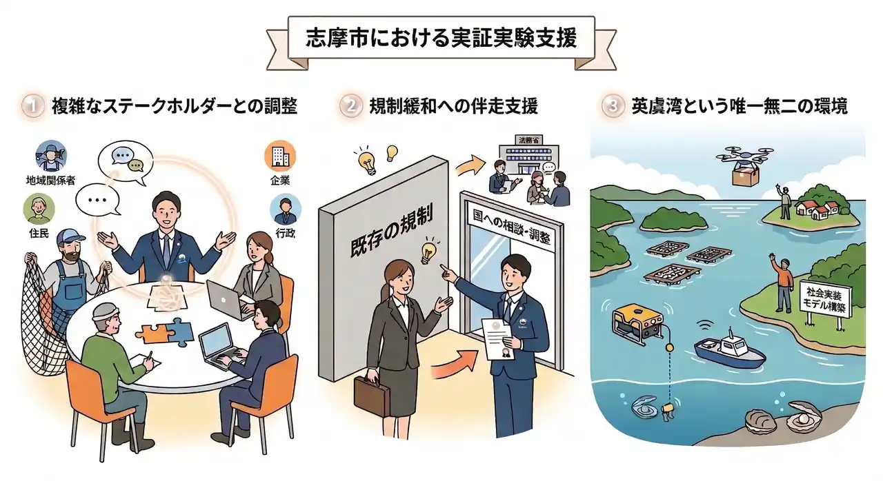 実証実験を成功させるためには、技術そのもの以上に「現場での合意形成」が重要です。志摩市では、以下の3つの支援を企業に提供します。 |