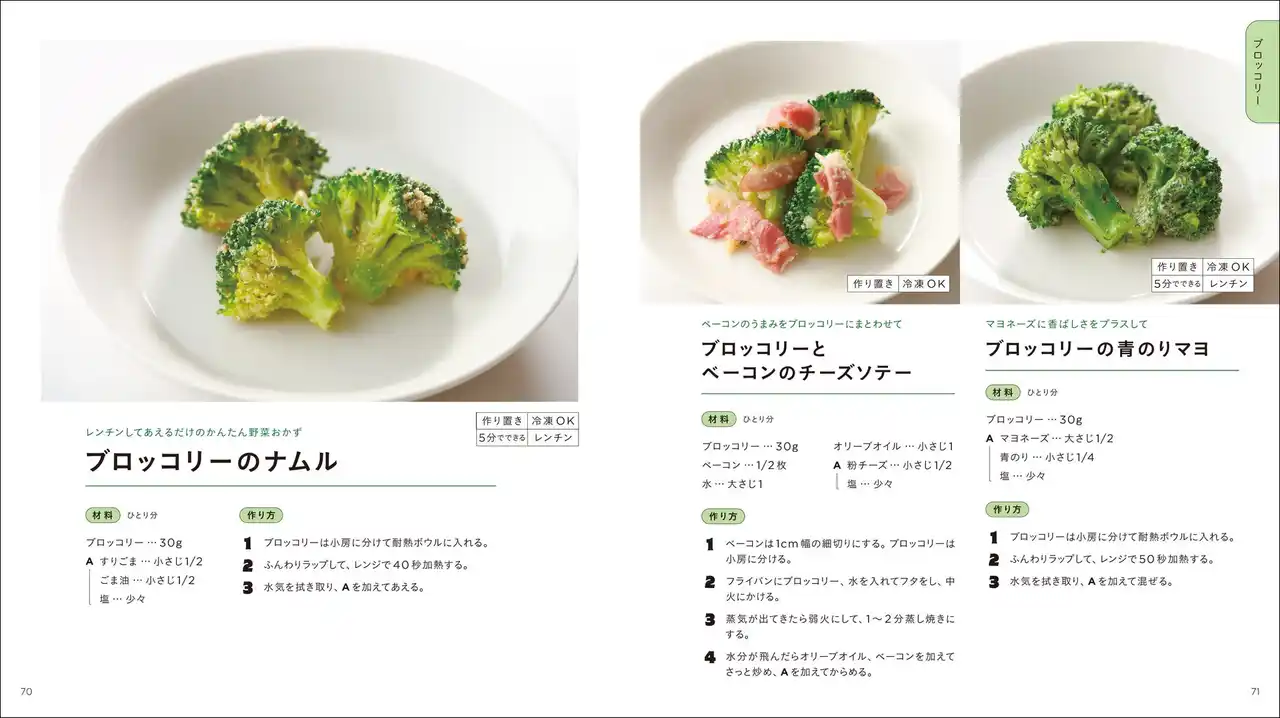 手早くできる肉、魚、野菜、卵、ストック品のおかずは全105品。それぞれに「作り置き」「冷凍OK」「すきまおかずに」「5分でできる」などのアイコンをつけ、忙しい朝に役立つ工夫をしています。 |