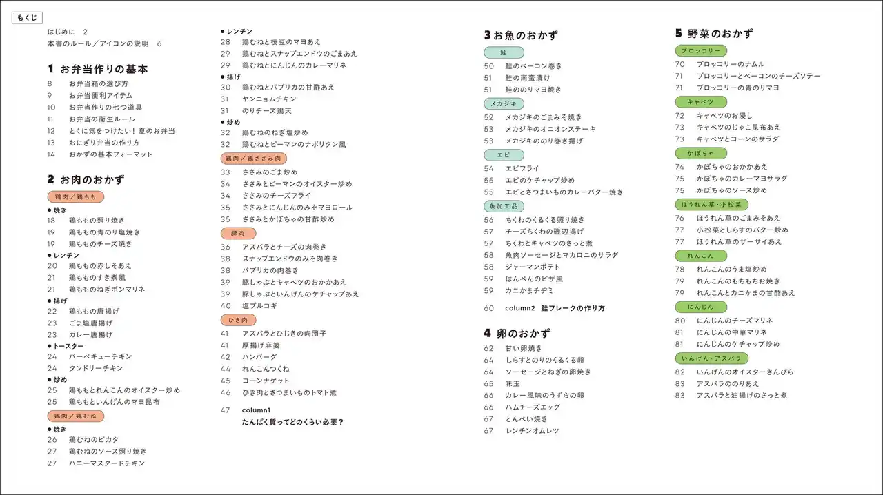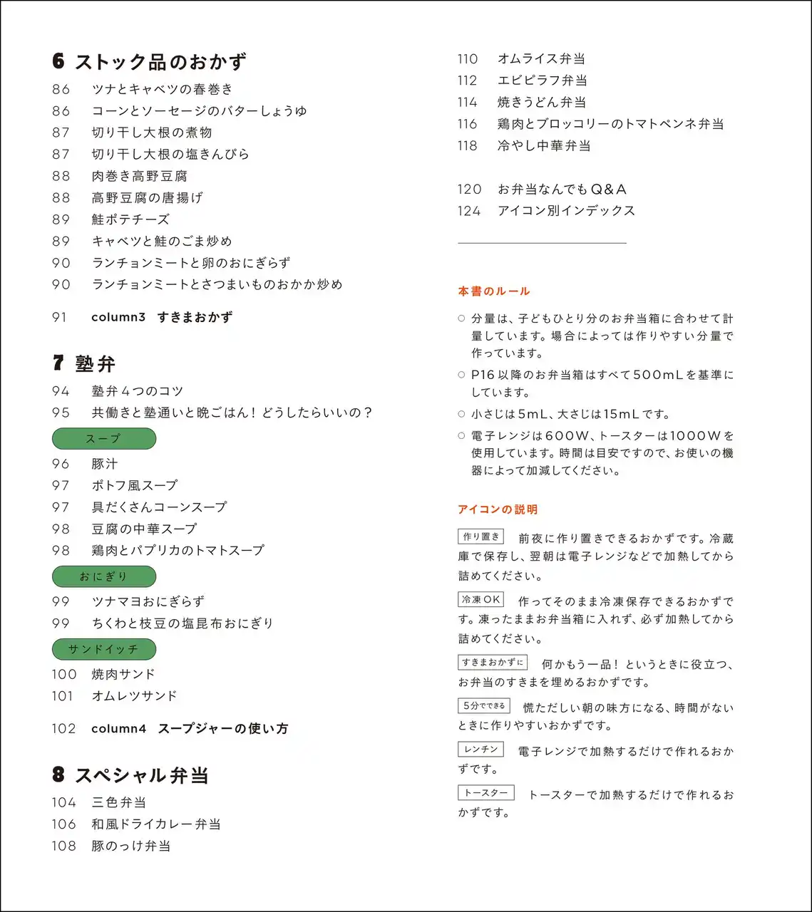 ほか通年使える衛生ルールや、猛暑の夏のお弁当作り、塾通いのお弁当のコツなども充実の一冊です。 |