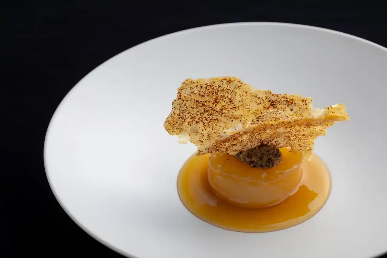 兄を支え、農政に力を注いだ弟・秀長へのオマージュ。大和国統治時代に縁のあった「湯葉」を使用し、現代的なコンソメとトリュフの香りで包み込みました。仕上げに八丁味噌のパウダーをまぶした湯葉チップを添え、秀長の誠実で温かな人柄を表現しています。 |