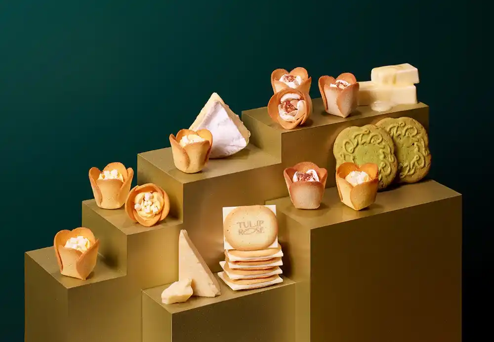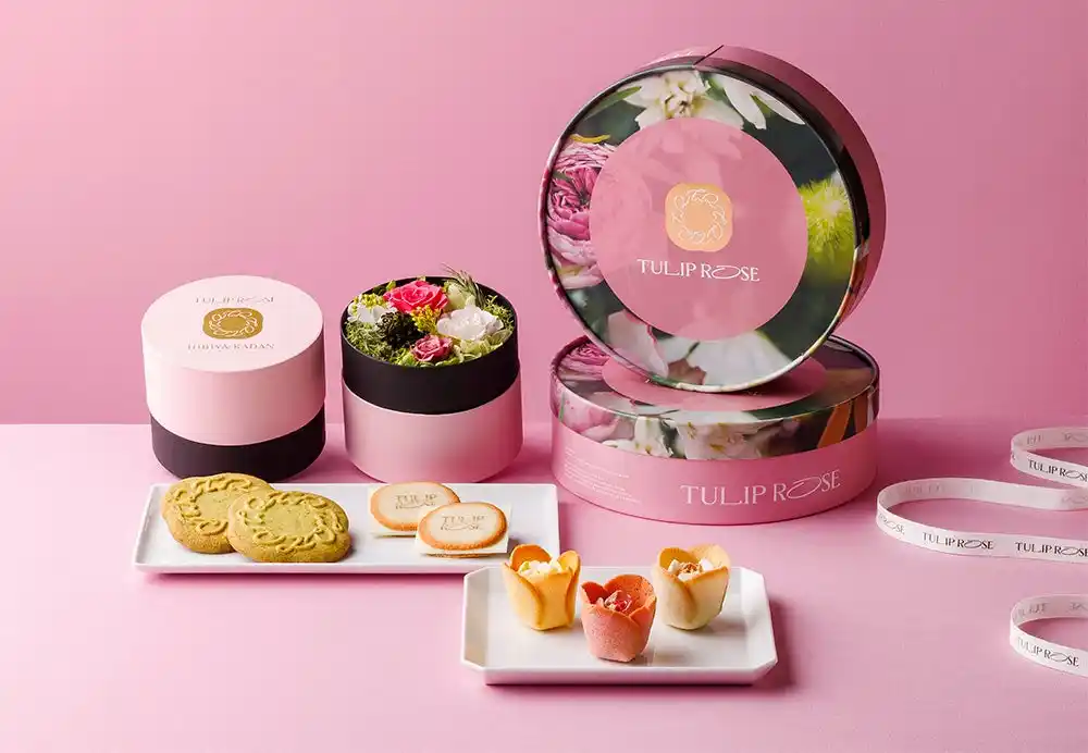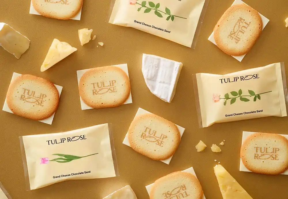 バターとチーズの香り溢れる美味しい花屋「TOKYO TULIP ROSE」。香ばしいチューリップの花びらラングドシャクッキーの中に、とろける生食感ショコラクリームのローズが咲いた代表作『チューリップローズ』は、累計5000万個販売を突破しました。 |