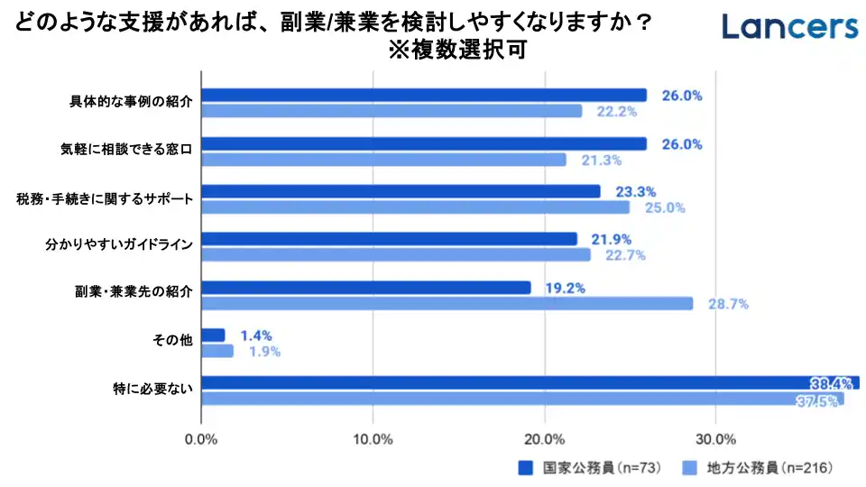 本調査では、副業/兼業を検討するうえで「副業先の紹介」や「具体的な事例紹介」が特に求められていることが明らかになりました。「ランサーズ for 公務員」では、公務員向け兼業説明会やガイドラインの提供などを通じて、公務員が安心して兼業を検討・実践できる環境づくりを進めてまいります。 |