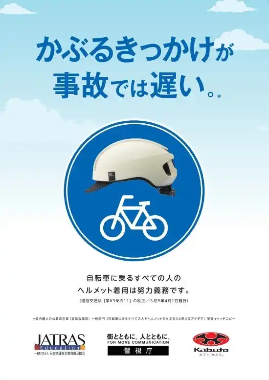 | 自転車用ヘルメット国内パイオニアメーカーの株式会社オージーケーカブト(所在地:東大阪市 代表取締役社長:木村弘紀)は、2026年より施行される改正道路交通法(自転車への青切符制度導入)を前に、自転車ヘルメットの着用啓発ポスターや、製品の画像など資料をまとめたWEBページを拡充させ、広く一般にご利用いただけるように案内しています。 | |||||||||