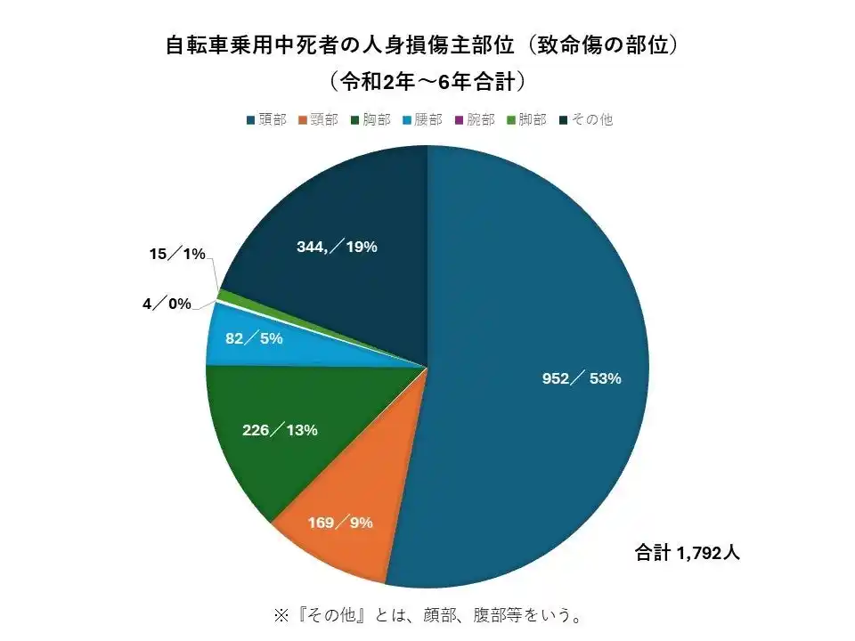 自転車用ヘルメットの着用は、2023年4月よりすべての自転車利用者を対象に「努力義務化」されました。今回の青切符導入において、ヘルメットの未着用自体は反則金の対象にはなりません。 しかし、警察庁の統計によると、自転車乗用中の交通事故では、ヘルメット非着用者の致死率が着用者に比べて約1.5倍以上高いだけでなく、最新のデータでは自転車事故で亡くなった人の約53%の方が頭部損傷を負っていることも明らかになっています。(※2) こうした数字は、命を守るために頭部の保護がいかに重要であるかを物語っています。 |