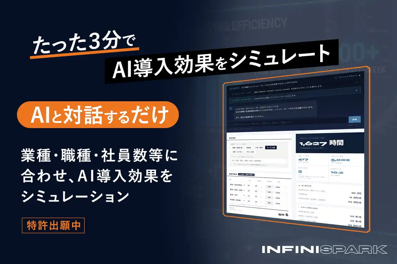 インフィニスパークは、AI導入検討の現場では「まず数字で示す」ことが経営判断を大きく加速させると考えています。そこで、AI導入効果に関する市場データ・業種別人件費データをもとに試算モデルを構築し、AIとの対話だけで誰でも3分程度でROIを算出できるシミュレーターとして無料公開しました。 |