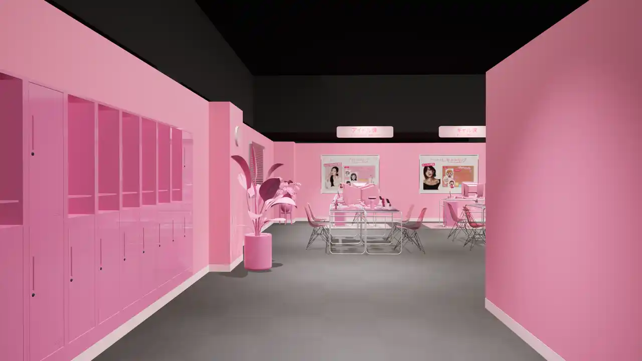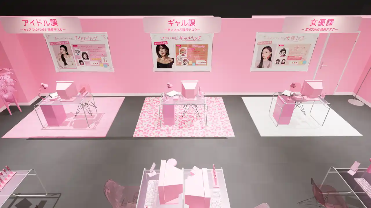“ロムアンド商事”のオフィスをモチーフとした“00年代風”のピンクのキュートな空間の中で、リップ |