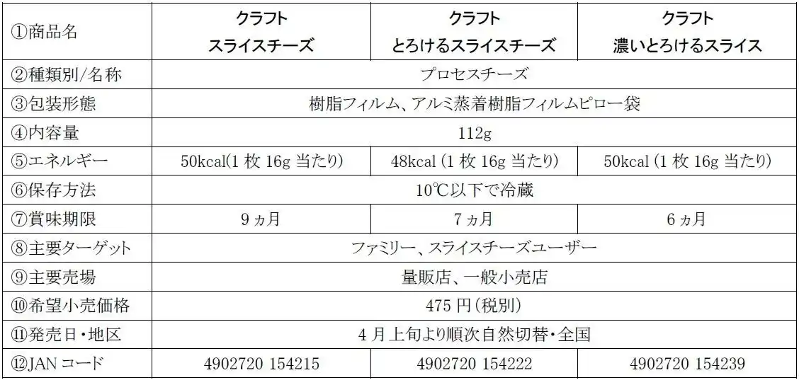 1.「クラフト スライスチーズ」シリーズは、独自の“旨味濃厚製法”により、チーズのコクと香りをしっかりと味わえるスライスチーズです。 |