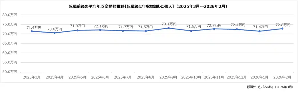 転職前後の平均年収変動額【転職後に年収増加した個人】:+72.8万円(前月差:+1.4万円) |