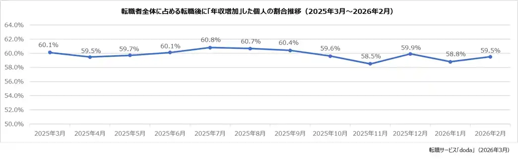 転職者全体に占める転職後に年収増加した個人の割合:59.5 %(前月差:+0.7ポイント) |