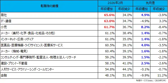 パーソルキャリア株式会社が運営する転職サービス「doda(デューダ)」(編集長:桜井 貴史)は、dodaエージェントサービスを利用して2026年2月に転職決定した個人の、転職前後の平均年収変動額と年収変動割合を発表いたします。 |