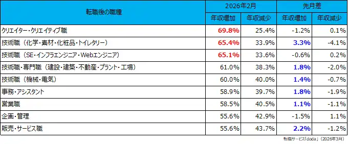 転職後に年収増加した個人が多かった職種は、「クリエイター・クリエイティブ職」(69.8%)、次いで「技術職(化学・素材・化粧品・トイレタリー)」(65.4%)、そして「技術職(SE・インフラエンジニア・Webエンジニア)」(65.1%)が続きました。 |