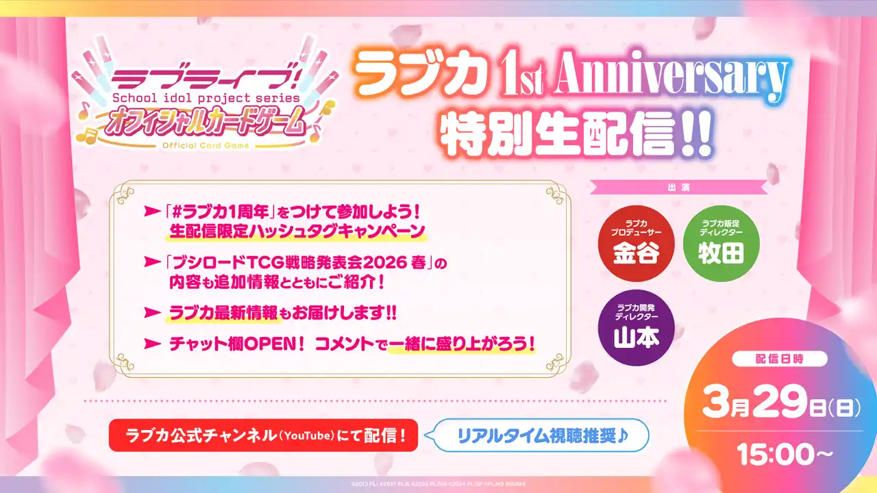 3月29日(日)15時より、ラブカ1周年記念して「ラブカ 1st Anniversary 特別生配信!!」をラブカ公式チャンネルにて配信いたします。 |