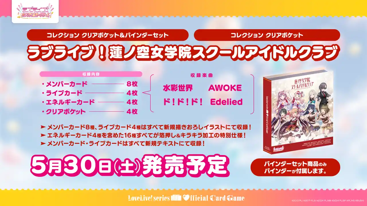5月30日(土)に「コレクション クリアポケット&バインダーセット ラブライブ!蓮ノ空女学院スクールアイドルクラブ」「コレクション クリアポケット ラブライブ!蓮ノ空女学院スクールアイドルクラブ」が発売となります。 |