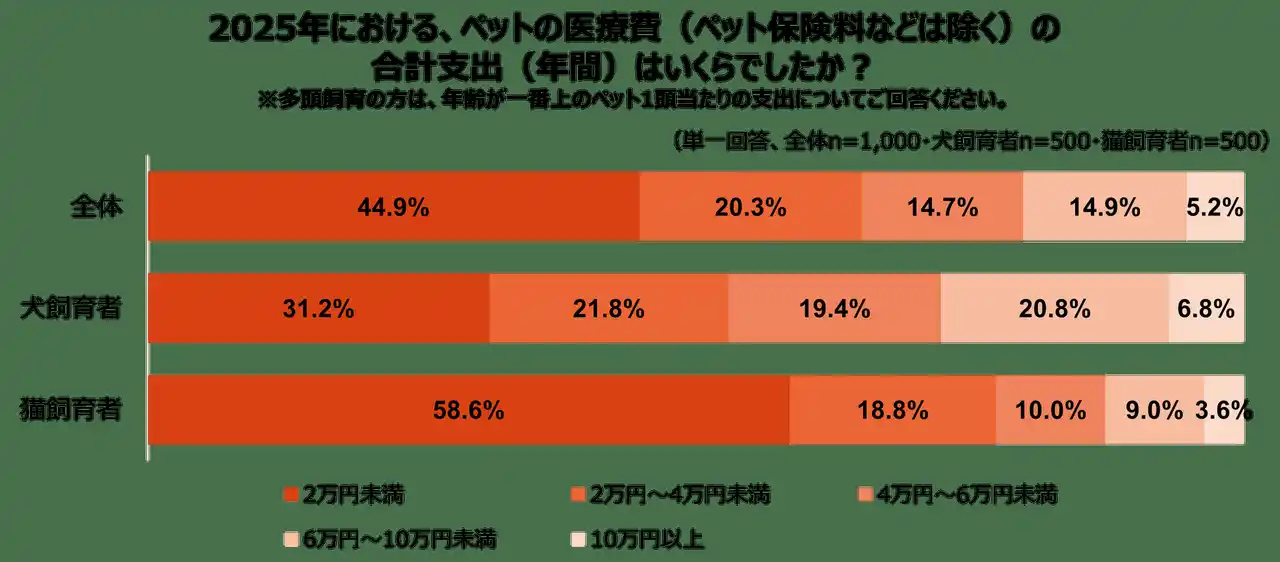 調査の結果、2025年の年間医療費は「2万円未満」が44.9%と約半数を占めましたが、犬と猫では異なる実態が見られました。猫の飼育者では「2万円未満」が58.6%と過半数にのぼったのに対し、犬は31.2%に留まり、「6万円以上」を支出する層も27.6%に達しています。 |