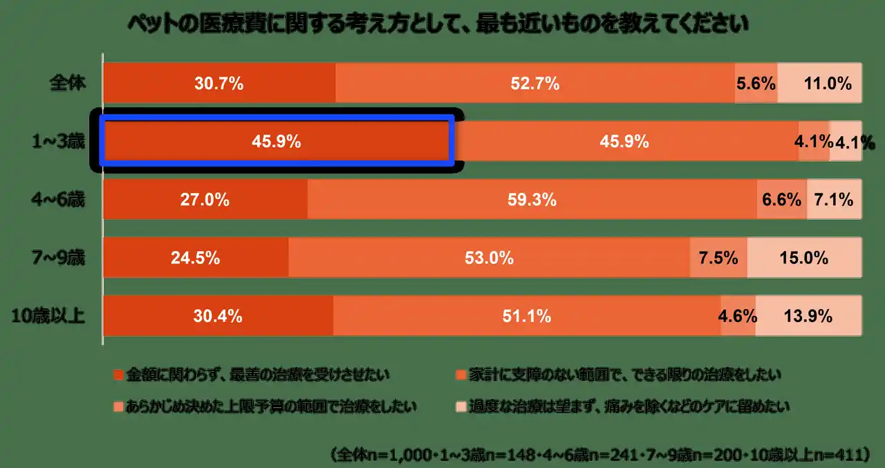 ペットの医療費に関する考え方は全体で「家計に支障のない範囲で」が52.7%と過半数を占めました。年齢別で見ると、ペットが1~3歳とまだ若く幼い時期ほど「金額に関わらず最善の治療を受けさせたい」という想いが強く、他の年代よりも圧倒的に多い45.9%に達する結果となりました。年齢が進むにつれて予算とのバランスを意識する傾向が強まるものの、どの世代も「できる限りのことをしてあげたい」という飼育者の想いは共通していることが分かります。 |
