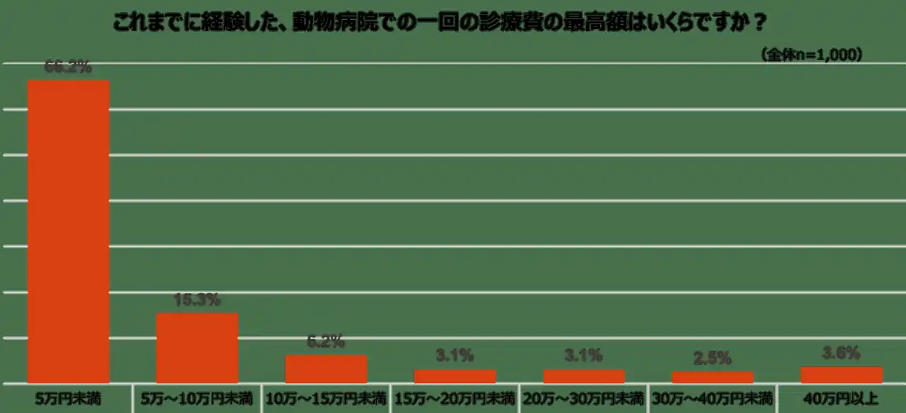 一回の診療費の最高額に関する調査では、「5万円未満」が66.2%で最多となった一方で、高額な診療を経験している飼育者も一定数存在することが分かりました。「10万円以上」の費用を経験した飼育者は合計で18.5%にのぼり、中には300万円という回答もありました。 |
