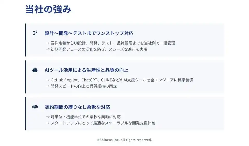 月単位・機能単位での柔軟な契約に対応し、スタートアップにとって最適なスケーラブルな開発支援体制を構築しています。 |
