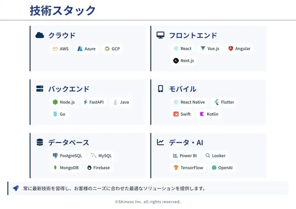 GitHub Copilot、ChatGPT、CLINEなどのAI支援ツールを全エンジニアに標準装備。開発スピードの向上と品質維持の両立を図りました。 |
