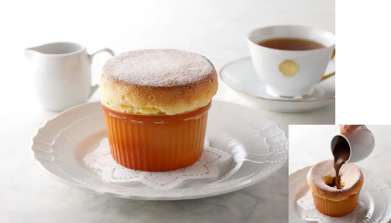 焼きたてのふわトロっとしたスフレ。優しい甘さの中にオレンジのリキュールが香るご褒美デザートです。チョコレートソースを注いでお楽しみください。 |