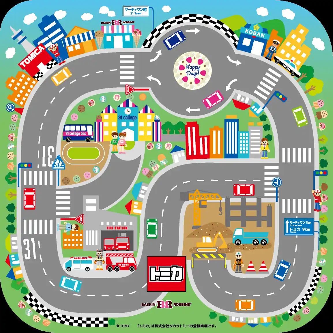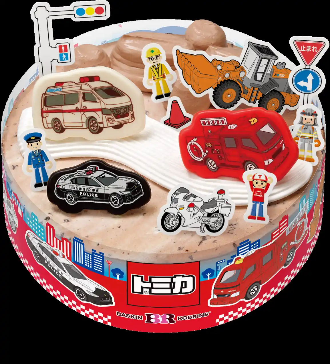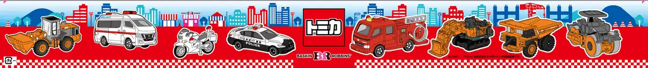 キャンペーントミカ「サーティワン アイスクリーム ポッピングシャワー」トラック付き!はたらく車が大集合した特別なトミカ アイスクリームケーキが新登場!お子様が大好きな街のヒーローである消防車、救急車、パトロールカーがチョコレートに!ホイールローダや信号機、標識、人のピックもついているので、シチュエーションを考えながら自由に飾って、トミカで遊ぶときのワクワクがケーキでも楽しめます。消防車やパトロールカー、工事車両が並んだかっこいいデザインのフィルムや、にぎやかなサーティワンタウンの様子をイメージした台紙は、サーティワンのお店やアイスクリームを持った子どもがいたりと、わくわくするデザインです。フレーバーは大人気のポッピングシャワーとチョップドチョコレート。 |