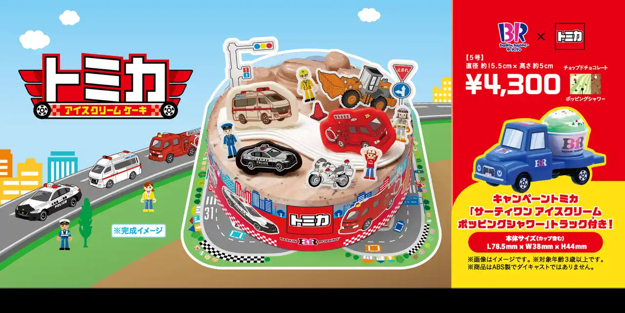 B‐Rサーティワンアイスクリーム株式会社(所在:東京都品川区上大崎3-1-1/代表取締役会長兼社長CEOジョン・キム:東京証券取引所(スタンダード市場):2268)は、2026年4月1日(水)から期間限定で、手のひらサイズのミニカー「トミカ」(発売元:タカラトミー)との初コラボレーション商品を発売します。国内外シリーズ累計販売台数10億台を超え、世代を超えて愛され続けるトミカの世界がそのままアイスクリームケーキになり、はたらく車が大集合!サーティワンだけのトミカタウンをお楽しみください。また本商品にはキャンペーントミカ「サーティワン アイスクリーム ポッピングシャワー」トラックが1台付属します。 |