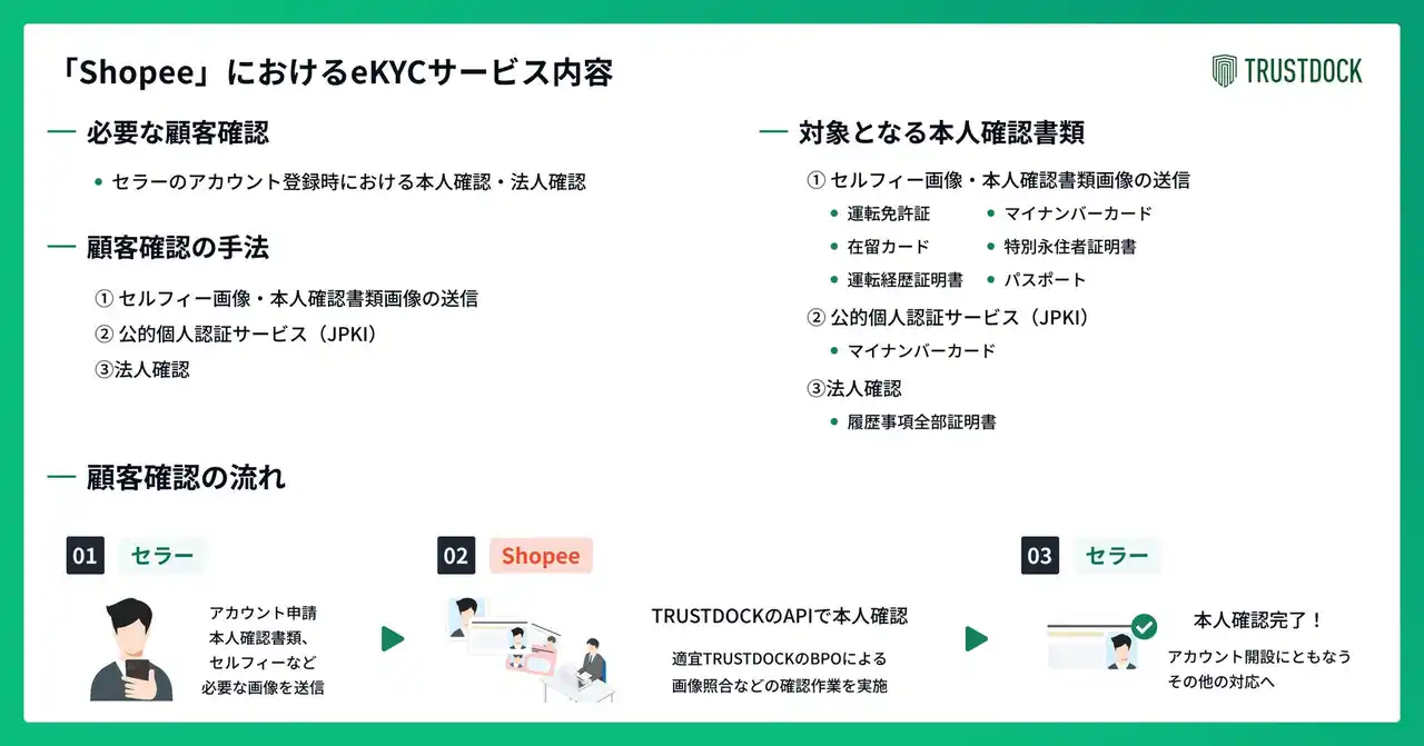 株式会社TRUSTDOCK(本社:東京都中央区、代表取締役:千葉孝浩、以下「TRUSTDOCK」)は、ショッピージャパン株式会社(本社:東京都中央区、代表:Ian Ho, Terence Pang、以下「ショッピージャパン」)が提供する越境ECモール「Shopee」において、セラーアカウント登録時の本人確認プロセスにeKYCサービス「TRUSTDOCK」が導入されたことをお知らせします。 |
