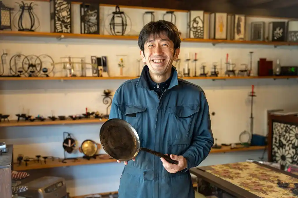 | 鍛造体験後には、工房に併設するギャラリーにて、鍛冶職人と、出雲地域に深く根付く火と向き合うものづくりの精神や、全国の鉄師たちが厚く信仰する鉄の神様「金屋子神(かなやごしん)」にまつわる伝承など、この地ならではの貴重なエピソードを学びます。また、日本刀を鍛え上げる高度な技術を応用して作られたあかり器具や、一生ものの道具として愛されるフライパンなど、伝統の技が形を変えて受け継がれている様子を見学できます。 | ||||||||||||||