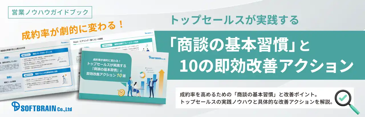 企業競争力向上のためのCRM/SFAであるesm(eセールスマネージャー)を提供するソフトブレーン株式会社(本社:東京都中央区、代表取締役社長:豊田浩文、以下「ソフトブレーン」)は、営業パーソンの成約率向上を支援する最新ノウハウ資料『トップセールスが実践する「商談の基本習慣」と即効改善アクション10選』を無料公開いたしました。「努力しているのに報われない」と感じている営業パーソンが陥りがちな10個の「課題」を特定し、トップセールスの視点に基づいた具体的な改善策をステップ形式で解説しています。 |