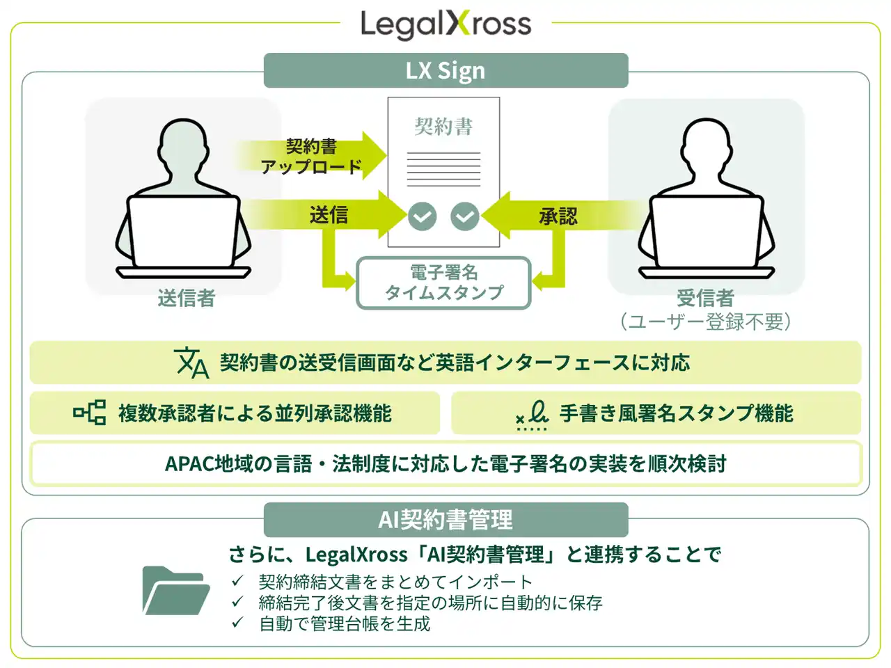 SMBCリーガルX株式会社(President, CEO:三嶋 英城、以下、「SMBCリーガルX」)は、アジア太平洋(APAC)地域へ進出する国内企業、及び同地域を中心に事業を展開する企業を主な対象として、クラウド型電子契約サービス「LX Sign(読み方:エルエックスサイン)」を、SMBCリーガルXの契約管理プラットフォーム「LegalXross」上にて日本国内向けに提供開始しました。 |