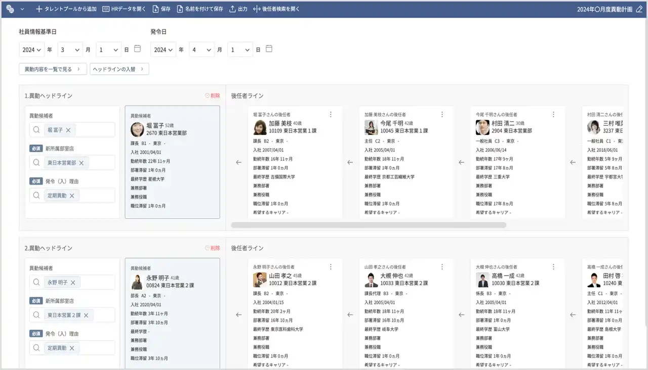 | これまで異動検討の材料となる情報は、「COMPANY」の人事管理製品にある情報に加え、現場へのヒアリング結果や紙資料、表計算ソフトなど、システム外の様々な場所に分散していました。その結果情報の分断が起こり、異動案策定の前段階である情報収集プロセスが煩雑化し、業務担当者の負荷が高くなっていました。これらの情報をすべてCTM2.0上に集約することで、従来は多大な時間を要していた、異動候補者や欠員候補者のリストアップ作業がシステム上で瞬時に行えるようになります。また、ドラッグ&ドロップの直感的な操作で異動のシミュレーションを実施することができます。変更前後のバランスを視覚的に確認しながら検討できるため、異動検討における人事担当者の作業時間を大幅に短縮します。 | |||