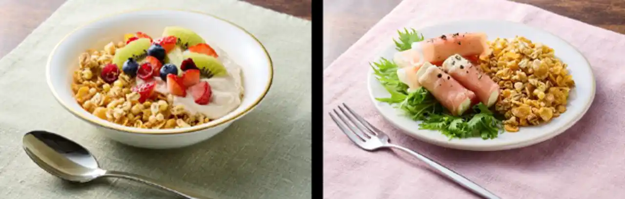 本商品は、フレークが含まれていることで食感にバリエーションがあり、生フルーツとの相性がよいほか、脂質70%オフ*¹で油が少なく甘みもあるため、塩味がある食材との相性にも優れています。 |