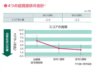 〈方法〉両眼に1回1-2滴、1日4回、Vロートドライガードプレミアムを14日点眼した。各自覚症状は4段階のスコアを用い、投与開始日、投与1週時、投与2週時(又は中止時)に各時点の来院日を含まない直近3日間のスコアの平均値を算出した。 |