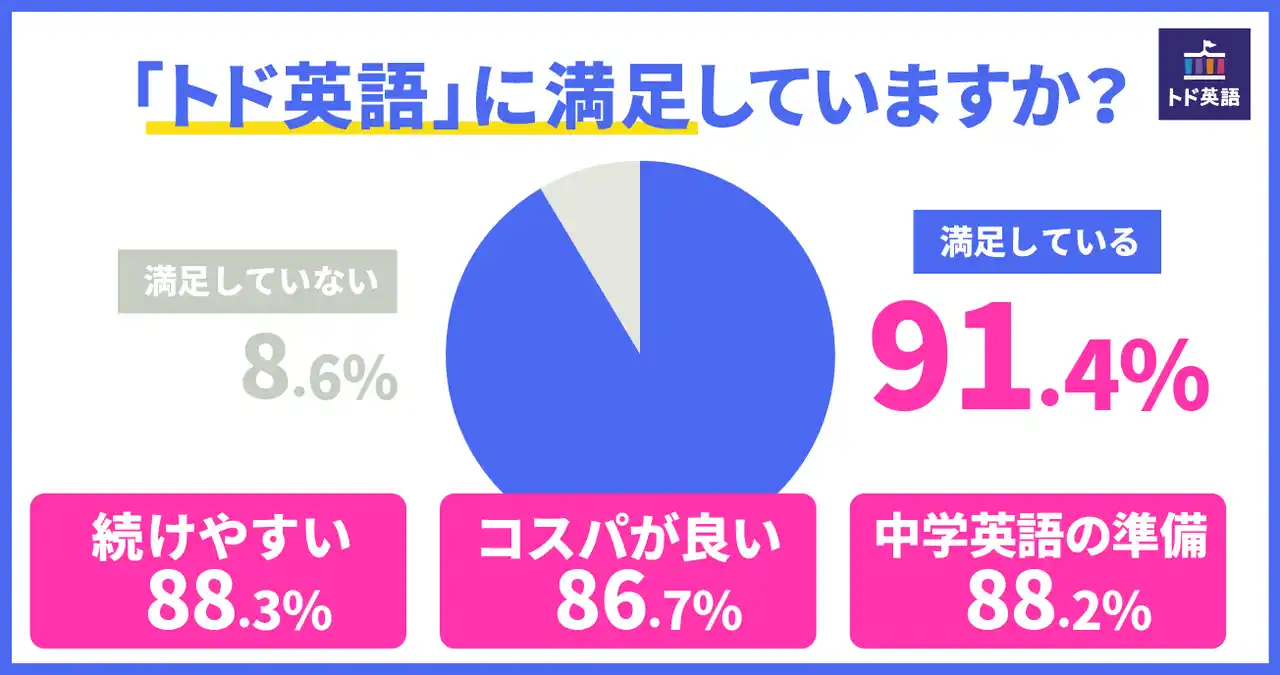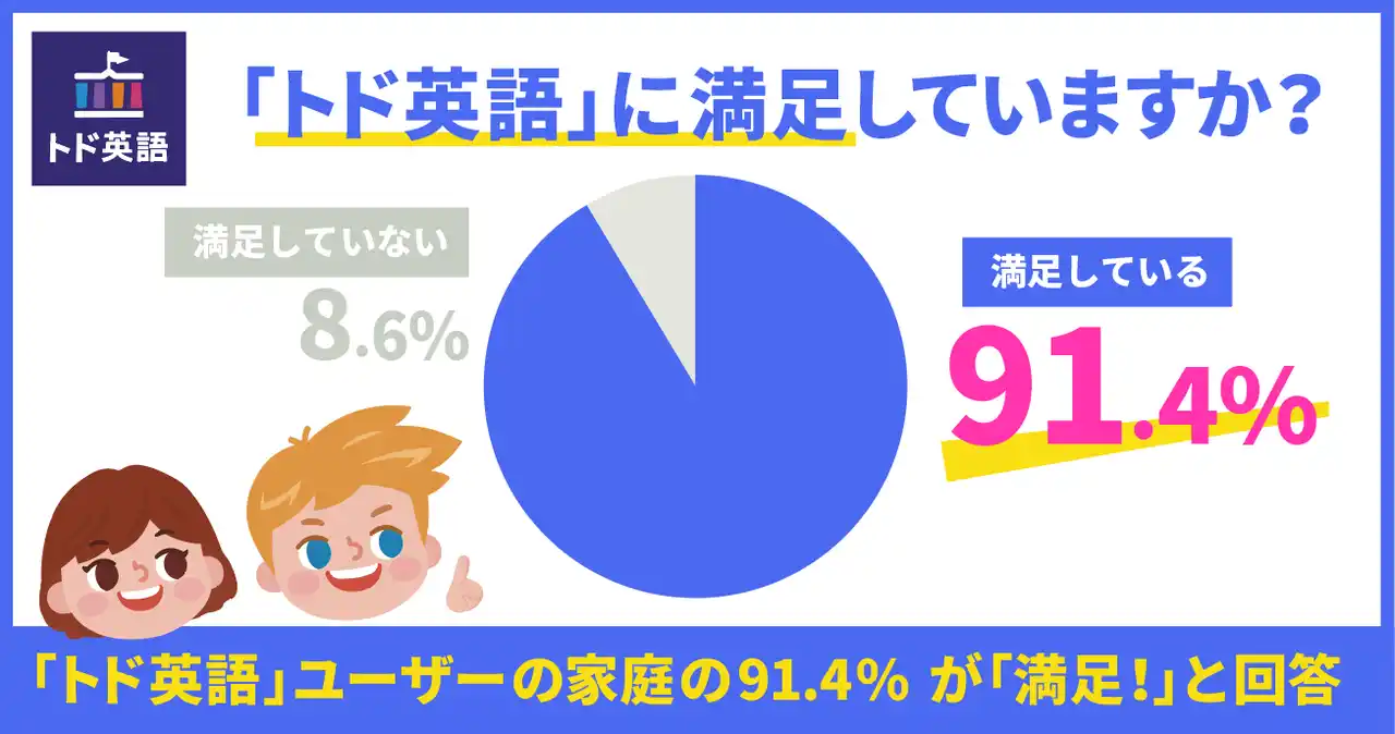 調査の結果、「トド英語」を利用する家庭の9割以上が高い満足度(91.4%)を示し、その効果や内容に肯定的な評価を寄せました。自宅で英語を学ぶ需要が高まるなか、「トド英語」が多くの保護者から高い満足度を得ていることが明らかになりました。 |